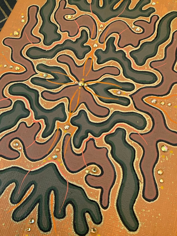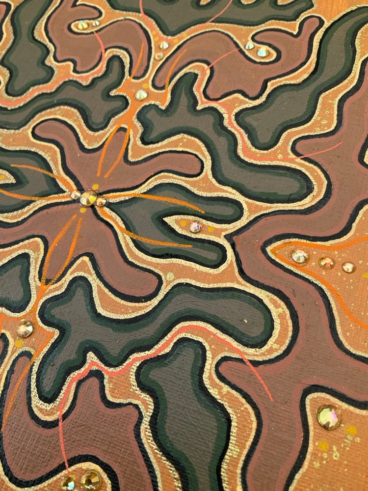 Mixed media, finished with posca pens, gold ink and iridescent gold glass gems