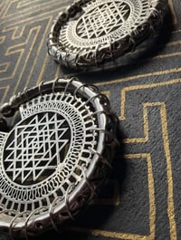 Handcrafted upcycled extra large statement large hoop ear weights using Vintage Indian white brass bangles and Vintage white brass Bali Sri-Yantra earrings.