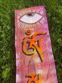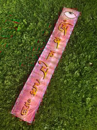 Handpainted 'Om Mani Padme Hum' wall hanging. Painted on 100% recycled cotton with a pink, purple, orange and yellow design background. Manta has been painted with orange and yellow ombre UV fabric paints and a black 3D shadow background. The design also features a Third Eye design which is also UV, and a gold border. Hanging has been hemmed but has been left to be hung however you chose.
